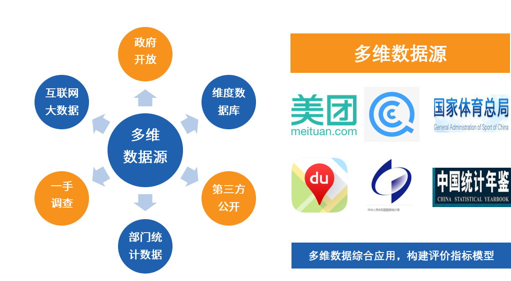 数据来源与数据处理:维度数据科技构建多重数据源,包括一手调查数据、部门统计数据(统计年鉴、统计公报及其他公开政府数据)和互联网大数据(美团网、京东、百度地图、企查查、词频搜索)等,实现多维数据综合应用。在数据处理方面,采用熵值法确定指标权重,运用综合评价法构建评价模型。