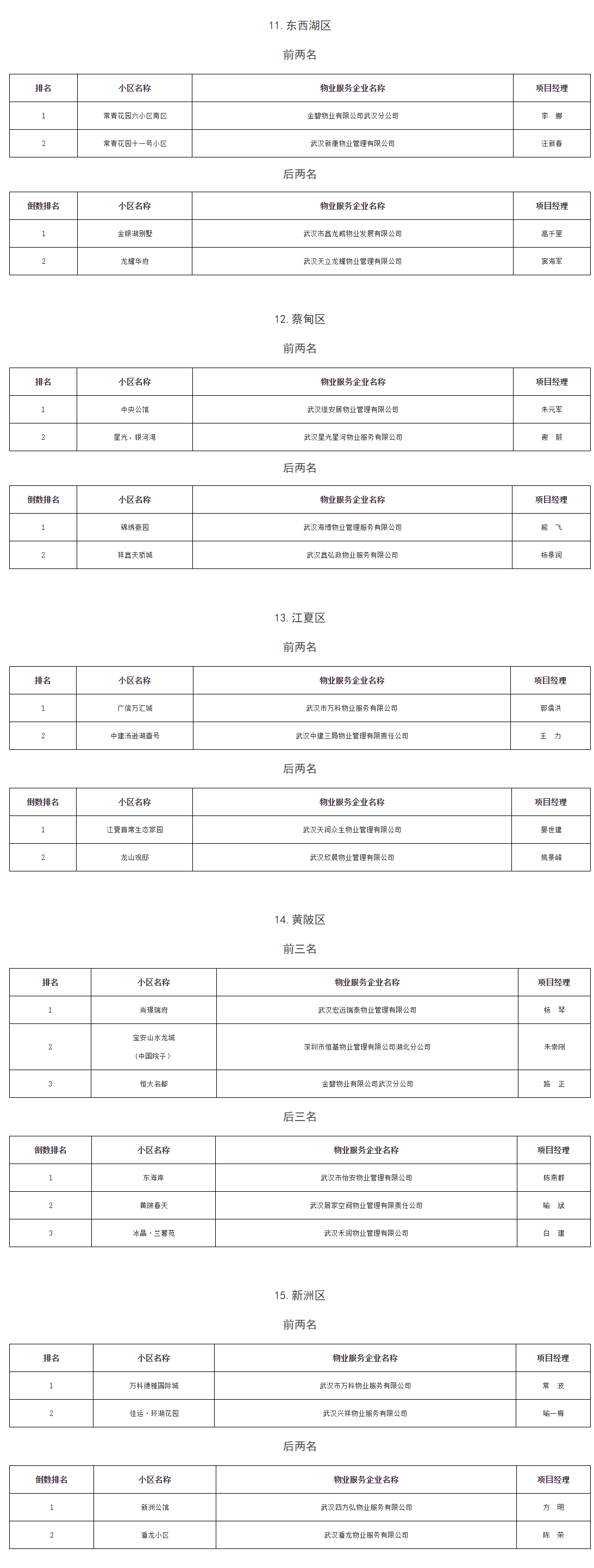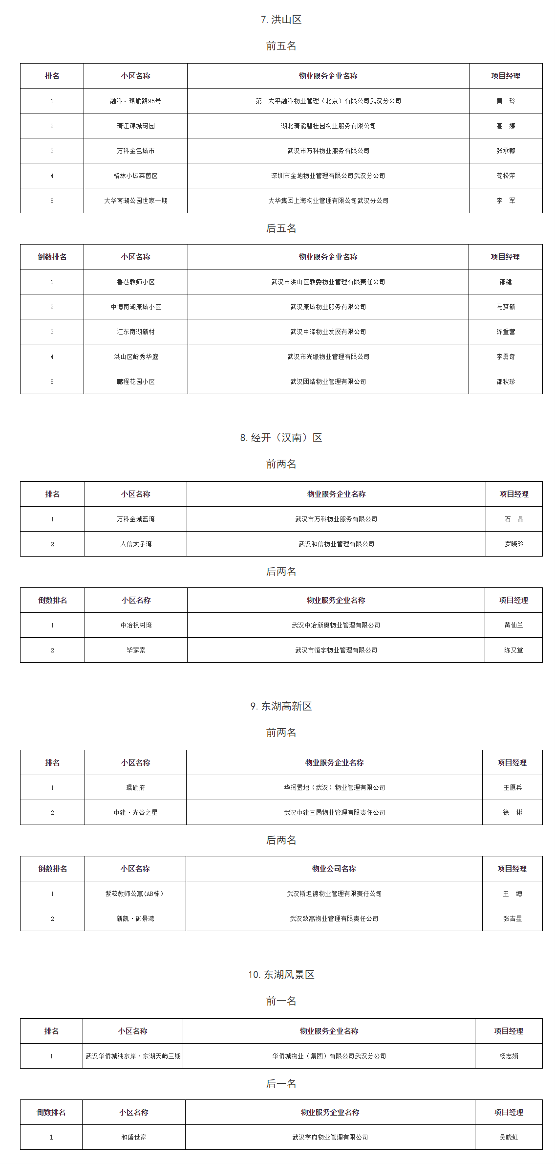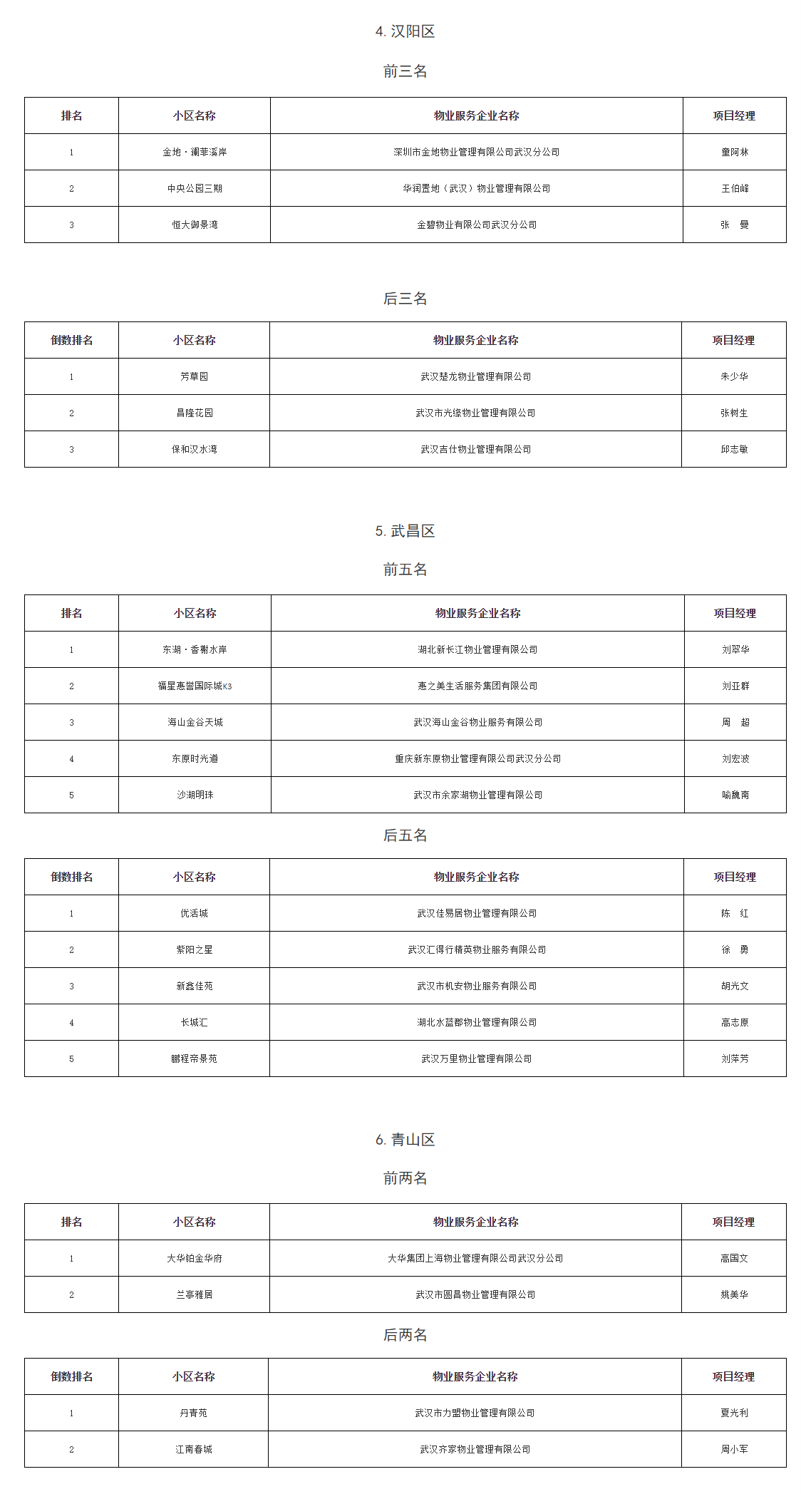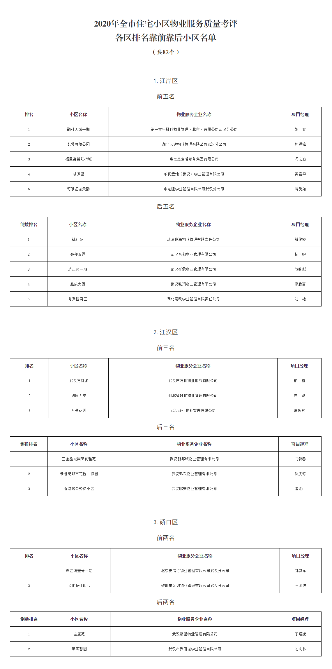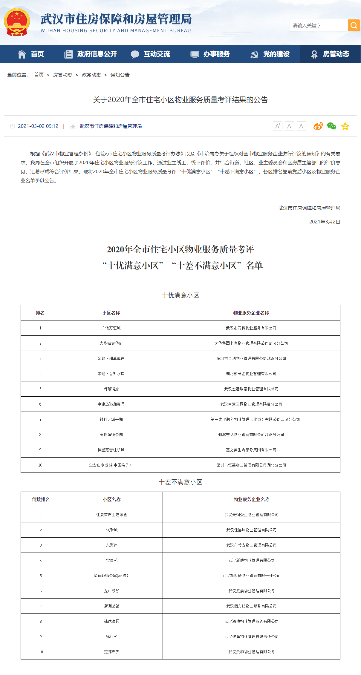 以下为武汉市住房保障和房屋管理局于2021年3月2日,发布的《关于2020年全市住宅小区物业服务质量考评结果的公告》,内容涵盖2020年全市住宅小区物业服务质量考评“十优满意小区”“十差不满意小区”、各区排名靠前靠后小区及物业服务企业名单。