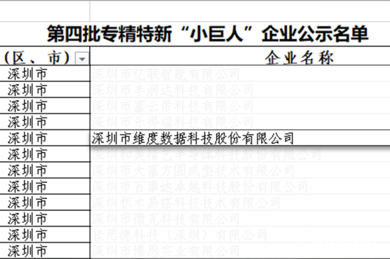 近日,第四批国家级专精特新“小巨人”企业名单公布,深圳市维度数据科技股份有限公司(以下简称“维度数据科技”)凭借在技术创新、产品研发、市场需求、拓展潜力、品牌影响等多方面的优势,被认定为国家级专精特新“小巨人”企业。这是维度数据科技继2021年被认定为广东省“专精特新”企业之后,取得的又一项荣誉。