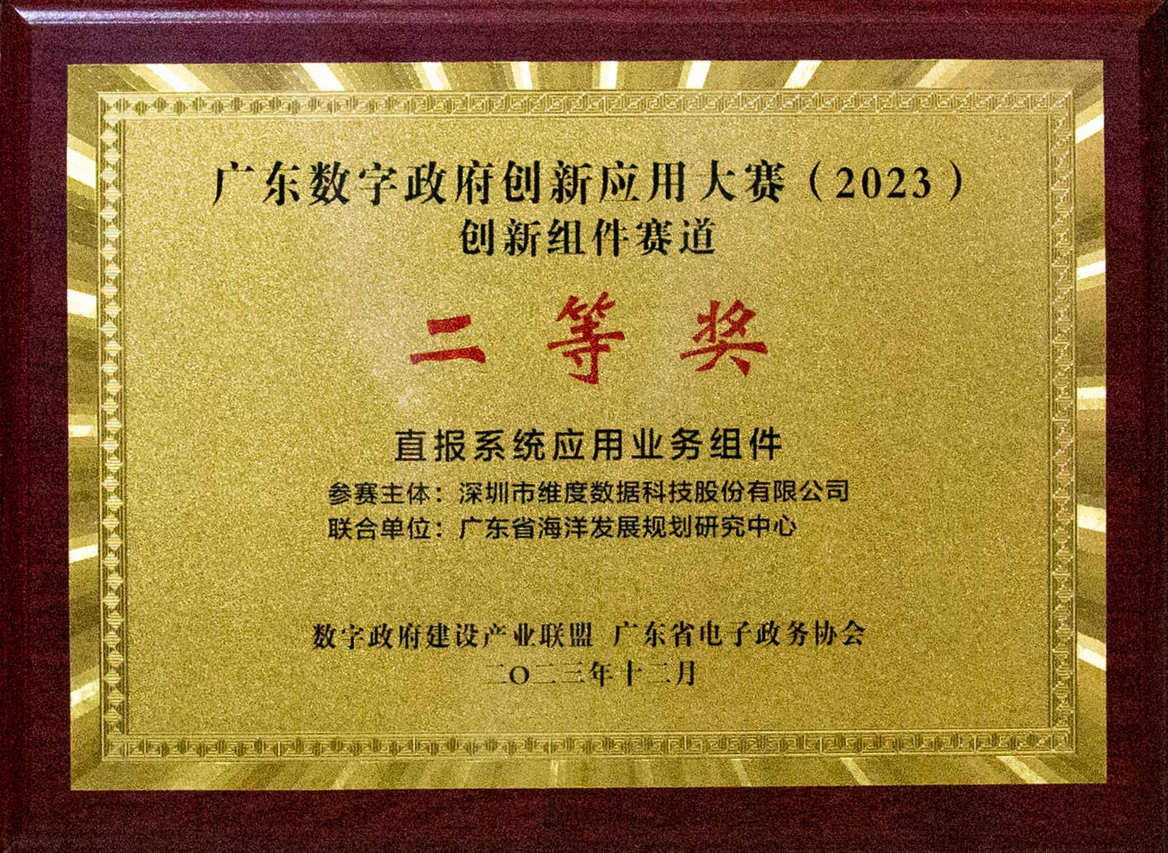 12月10日,由广东省政务服务数据管理局指导举办的广东数字政府创新应用大赛(2023)颁奖仪式在广州举行。深圳市维度数据科技股份有限公司(下称“维度数据科技”) 作为参赛主体申报的“直报系统应用业务组件”荣获创新组件奖二等奖。